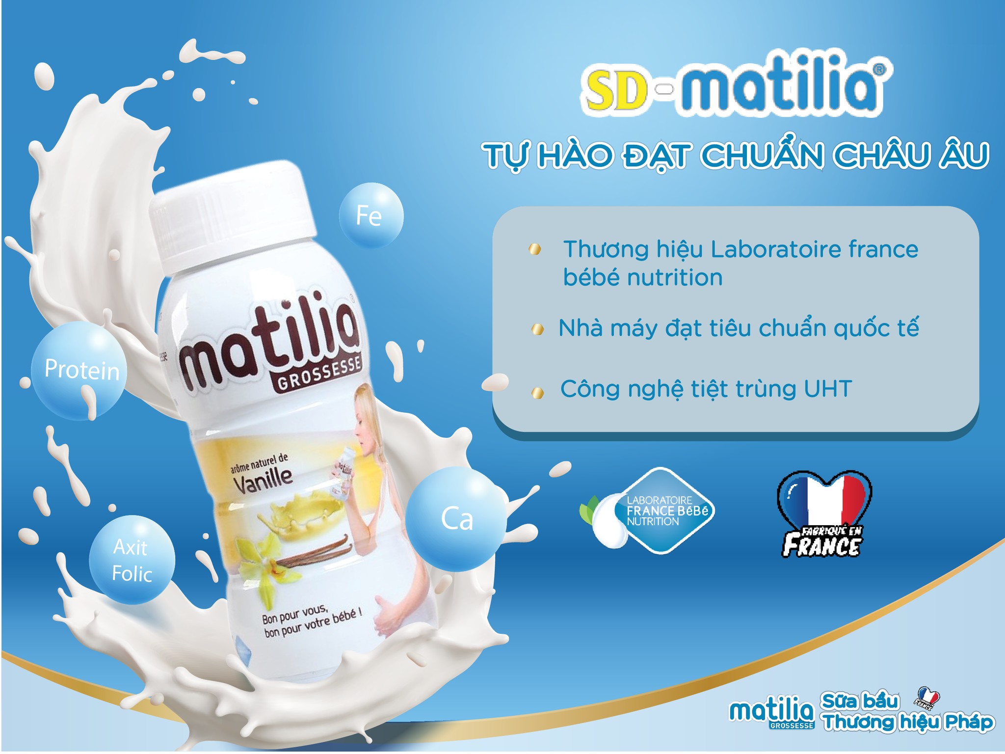 Sữa bầu Matilia được sản xuất tại các nhà máy đạt chuẩn quốc tế tại Pháp, áp dụng quy trình kiểm soát chất lượng nghiêm ngặt theo tiêu chuẩn ISO và HACCP. Với nguồn gốc nguyên liệu tự nhiên được tuyển chọn kỹ lưỡng từ các vùng chăn nuôi bò sữa sạch của Pháp, sữa bầu Matilia được thiết kế đặc biệt cho phụ nữ mang thai và cho con bú.